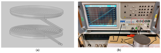 (a) FEM model geometry of the Würth Elektronik 400 W WPT (Würth Elektronik, Vilnius, Lithuania) coils. (b) Experimental setup: (1) impedance analyzer “Wayne Kerr 6500B”, (2) coils Würth Elektronik 400 W WPT, (3) coil holder.