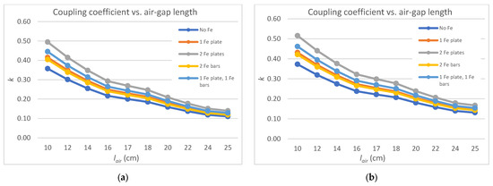 The FEM simulations were accomplished for different air-gap lengths in the range of 10 ÷ 25 cm, which encompass Z Class 1 ÷ Z Class 3 classes according to SAE J2954 [35]. The results for the coil systems having circular and square geometries are presented in Figure 13a and Figure 13b, respectively.