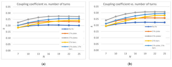 It is well-known that ferromagnetic (ferrite) cores or backings are often used in designs of coil systems to maximize the coupling between the coils. The coil systems for WPT are no exception. The impact of the ferrite backing design on the coupling coefficient of the WPT coils was investigated in this study. The conventional, symmetrical systems without ferrites, with the planar ferrite cores, the cores made from ferrite bars, and the non-conventional, asymmetrical systems were considered. The latter structures are potentially beneficial for automotive applications, because of the different requirements for each coil of the system. A minimization of the weight and size of the coil mounted on vehicle is crucial, while the stationary case is less demanding in the latter sense. We investigated two types of such coil systems with non-symmetrical structures. The first one consists of one coil with a planar ferrite backing, and the second coil lacks a ferrite backing (Figure 8). The second investigated structure consists of one coil having a planar ferrite backing and the second coil having a backing made from ferrite bars (Figure 9). The symmetrical coil structures with ferromagnetic bars (Figure 10), with ferromagnetic plates (Figure 11), and without any ferromagnetic cores (Figure 12) were analyzed as well. Two geometries of the coils, circular and square, with the mentioned core structures were investigated.