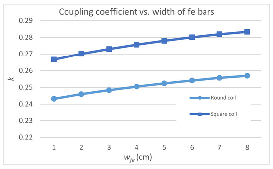 The results show that the dependencies of the coupling coefficient vs. width of the bars have a nearly linear relationship in the considered range. It is valid for both circular and square-type geometries. Predictably, the higher coupling coefficient values are produced by the coil structures which have backings with higher ferrite volume.