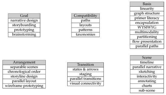 - Narration: The narration describes all the design rules associated with the arrangement and movement of different placeholders in combination with each other. We further separated the narration into four design rules as follows: storyline foundation, block formation, group composition, and frame fixation.