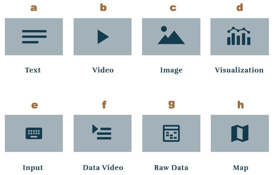 - Modality: The modality of a placeholder varies; e.g., text, image, visualization, video, map, raw data (including data tables), input, and data video. The modality symbol is not mandatory but is recommended for representing the content role. Figure 8 shows different modality types in our design language.