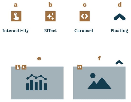 - Expressive Symbols: Each placeholder may have one to many (n) expressive symbols positioned to express different features of the visual element. The symbols indicate the visual element’s inner-narrative property, including interactivity, effect, carousel, and floating symbols. Figure 9 shows these expressive symbols.