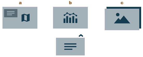 - Placeholder: A placeholder is a schematic depiction of visual content. This visual element represents either a portion or an entire visual scene. The representation of a placeholder is an empty frame marked with a symbol of its modality (content type) in the center. On the theoretical level, a placeholder is an encapsulated entity. It can encompass one to many (n) placeholders. These new descendant placeholders represent their own modality separately. A placeholder’s size proportionally resembles its counterpart’s original content size, although authors may ignore the precision for rapid prototyping and storyboarding. A long graphic with a higher length than the visual frame results in long proportional placeholders. Placeholders depending on their position and their arrangements, come in different types, including primary, overlaid, affixed, stacked, and grouped types (Section 3.1). Figure 7 shows a placeholder representation. This representation shows a schematic figure of the actual content in the DDS narrative structure. Two main factors for this representation (size and modality) change depending on the corresponding contents of the DDS narrative structure.