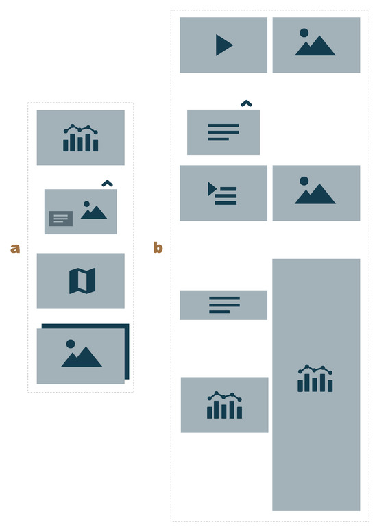 - Stacking: Each placeholder may stack multiple layers of visual elements. In this case, they are also stacked placeholders. To visualize them, instead of one frame, two stacked frames should be used that are slightly shifted against each other. A stacked placeholder cannot be divided further. Since stacking items puts some of them out of visual sight, stories need more interaction from the user. This concern is explicitly stressed in author-driven stories as a contradiction.