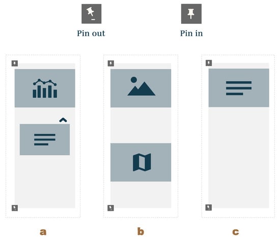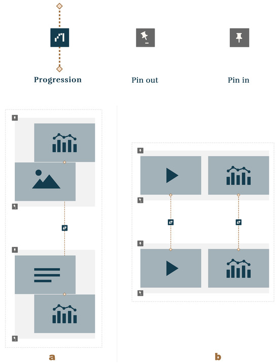 - Frame Fixation: A frame fixation is a portion of a storyline that sticks to the viewport to prevent progression in the narrative flow by scrolling or other interactions. With each fixation, the normal flow of DDS interrupts and then continues. A fixated area can grow in both directions using the block formation and storyline foundation to align placeholders. Each fixation has starting and finishing points that indicate the fixated area’s beginning and end. For DDS with separated sequenced scenes (shots), the fixation area begins and ends with each placeholder. In the case of any parallel visual elements, the fixated area becomes longer as an indicator of the fixation time against other elements. Each storyline can have multiple (n) consecutive fixated areas that may overlap. The beginning of a fixated area is always determined by a placeholder called the first pinned. To visualize the frame fixation, a rectangular shape starting from the first pinned covers all the area behind the proceeding elements until it reaches the finishing point. Two visual symbols, pinning in and pinning out, are positioned at the fixated area’s start and end. Figure 13 shows frame fixation.