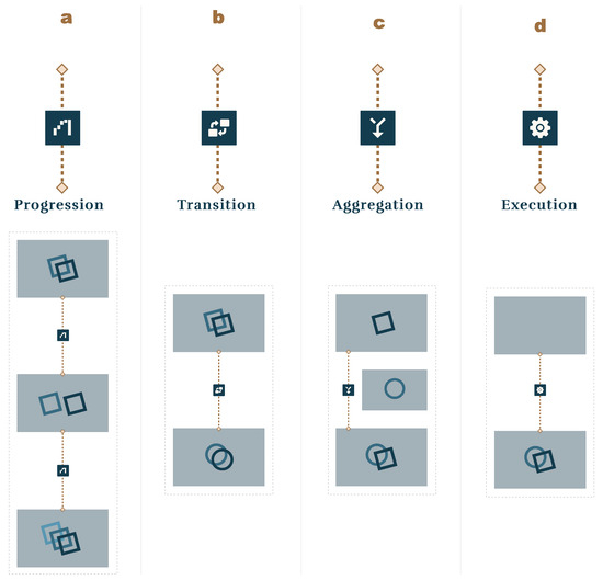 - Connection: A connection represents a change between two continuous placeholders. Placeholders are connectable only if their connection path does not need to collide with any placeholder with the same type as the two ends. There are four types of connections: transition, progression, aggregation, and execution. To visualize a connection between two placeholders, a dashed straight line exits one side of the source element and enters the opposite side of the destination element while crossing below all the placeholders in between. At any form of connection, the collision points of the line to the sides of the source and the destination placeholders are marked. Two ICON signs are necessary to distinguish the two ends of the connection. Midway, over the connection line, a symbol represents the type of connection. Figure 14 shows different types of connections.