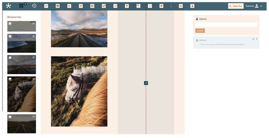 ![]() | Resources Panel: DataStoryDesign supports various media files, also called resources, in file formats that include images, gifs, videos, and maps. The system for file management archives files separately per project with a total space of 1 GB. Adding media files to the placeholders turns a schematic wireframe into a content box with options for sizing using drag and drop. Adding resources to the replica serves the double functionality of prototyping and storyboarding. |