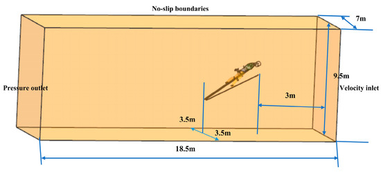 The computational domain size for the multi-body system is 18.5 m in length, 7 m in width, and 9.5 m in height, as shown in Figure 2. Considering the flow separation in the wake and the potential influence of the athletes’ body shape on the flow field, the multi-body system’s refined 3D solid model is divided into several regions for grid generation, as shown in Figure 3. These regions include the athlete’s body surface area, the skis’ surface area, the wake region behind the athlete’s upper arms, the wake region behind the waist–hip junction, the wake region behind other parts of the athlete’s body, the wake region behind the skis, and the region far away from the athlete and the skis.