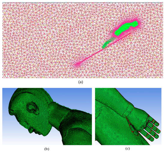 Mesh distribution. (a) Volume mesh; (b) and (c) surface mesh on the athlete.