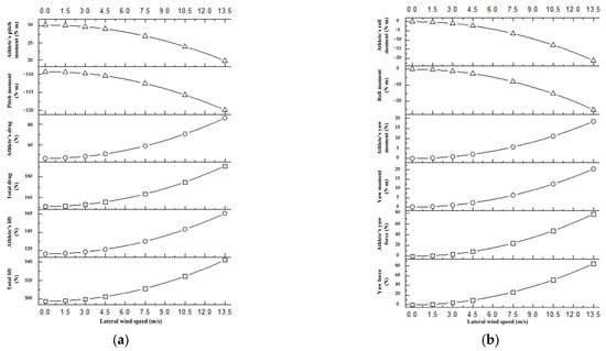 Change curves of aerodynamic characteristics under different lateral wind conditions. (a) The changes with different lateral wind speeds in total lift, total drag, pitch moment, athlete’s lift, athlete’s drag, and athlete’s pitch moment. (b) The changes with different lateral wind speeds in yaw force, yaw moment, roll moment, athlete’s yaw force, athlete’s yaw moment, and athlete’s roll moment.