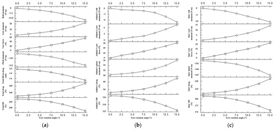 Change curves of aerodynamic characteristics under different yaw rotation angles. (a) The changes with different yaw rotation angles in total lift, total drag, total lift-to-drag ratio, pitch moment, yaw force, yaw moment, and roll moment. (b) The changes with different yaw rotation angles in athlete’s lift, athlete’s drag, athlete’s pitch moment, athlete’s yaw force, athlete’s yaw moment, and athlete’s roll moment. (c) The changes with different yaw rotation angles in skis’ lift, skis’ drag, skis’ pitch moment, skis’ yaw force, skis’ yaw moment, and skis’ roll moment.