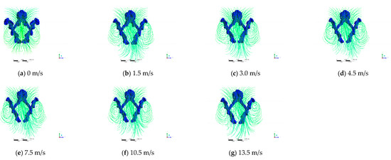Furthermore, from the flow field results depicted in Figure 7, it is observed that as the lateral wind speed increases, the scale of vortex structures behind the skis undergoes relatively minor changes. However, the vortex patterns behind the athlete exhibit significant variations, shifting increasingly towards the direction of the lateral wind. This indicates that the athlete is more affected by the lateral wind, resulting in more pronounced changes in forces and moments generated by the athlete. This observation aligns with the previously obtained numerical statistics of the mechanical characteristics.