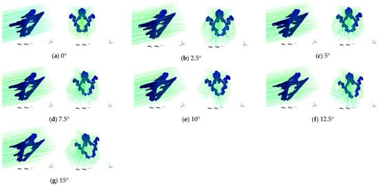 Furthermore, the flow field results in Figure 9 demonstrate that with variations in the roll rotation angle, the velocity values of the streamlines exhibit minimal changes, but the streamlines noticeably shift towards the left rear. Simultaneously, the vortex patterns undergo significant transformations, transitioning from an initial symmetric configuration to an asymmetric one, with a gradual decrease in vortex structure size behind the athlete and skis. These observations indicate that roll rotation significantly alters the original mechanical characteristics of the system, giving rise to new lateral forces and corresponding moments that align with the previously obtained numerical statistics of the mechanical characteristics.