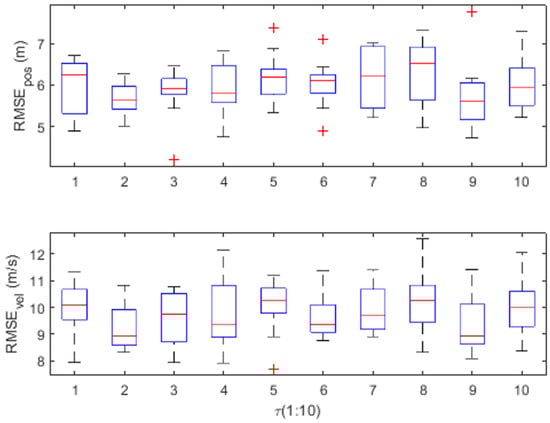 In Figure 3, we conducted a comprehensive analysis to evaluate the impact of the forgetting factor on the performance of the proposed VBAIEKF algorithm. Systematic variations of the variable within a certain range can identify various factors affecting the algorithm’s performance. Affecting the algorithm’s performance, , the impact of the forgetting factor significantly diminishes, thereby accelerating the convergence speed, reducing the RMSE, and making the algorithm output trajectory more perfect. The current configuration appears to have achieved the optimal balance between convergence speed, accuracy, and overall stability. Therefore, we chose for the subsequent comparative analysis.