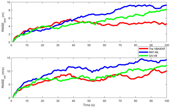 Figure 4 presents a thorough comparative analysis, wherein the proposed VBAIEKF algorithm is juxtaposed with existing optimization algorithms GA-VB and RKF-ML in terms of the noise , a specific number of iterations (). The comparative analysis is based on the root mean square absolute error (ARMSE) of velocity and position estimates. The results underscore the efficacy of the VBAIEKF algorithm; compared to the existing optimization algorithms RKF-ML and GA-VB, the VBAIEKF exhibited significant improvements in and , with increases of 21.81% and 22.11%, respectively. Table 1 shows that under noise , the convergence speed was enhanced by 49.04%, demonstrating accelerated convergence and significantly enhanced estimation precision. This highlights the algorithm’s capacity to provide reliable and accurate estimates.