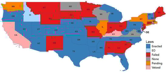 While the literature explores optimistic and pessimistic predictions about AVs, the present research provides a grounded analysis of how legislative actions are translating these expectations. This helps in understanding the practical challenges and considerations, which often go beyond theoretical discussions, that policymakers face. Whereas some research provided a high-level comparison of how other countries approach AV laws [], there have been no comprehensive and recent studies focused on the dynamic U.S. regulatory landscape. Hence, the present research fills that gap by conducting an exhaustive review of recent AV bills in the United States to uncover the multifaceted factors influencing the success or failure of AV legislation.