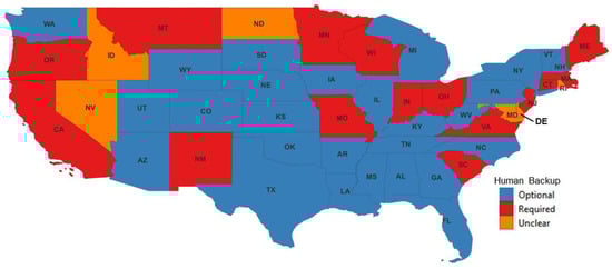 By the end of 2023, all 48 states of the CONUS, except 4, had processed legislation relating to the operation of Avs in their district. Figure 2 shows the status of AV regulations at the end of 2023 for the CONUS. Figure 3 shows the requirements for a human backup driver in these regulations. Laws requiring a human backup driver assume SAE level 3 or level 4 operation, expecting that a person in the vehicle will take over control as needed.