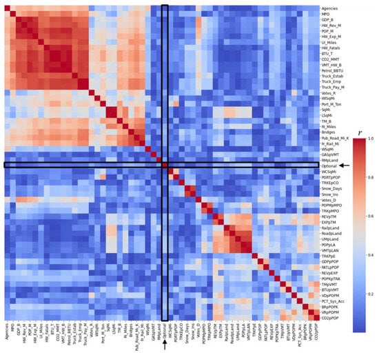 The heatmap sorted the variables by their correlation level to easily identify the cluster of collinear variables near the top left. The highly correlated variables are aggregate variables such as GDP, population, vehicle miles traveled, highway revenue, highway fatalities, urban interstate miles, energy utilization, fuel consumption, carbon dioxide emissions, the number of transit agencies, trucking establishments, trucking employment, trucking payroll, and the number of MPOs. The procedure eliminated 28 aggregate variables, resulting in 27 variables to further evaluate for collinearity reduction. Based on a customary Pearson correlation coefficient threshold of 0.75, collinearity reduction eliminated 8 variables, leaving 19 for ML. The heatmap also highlights the binary target variable “optional” with an arrow and a bounding box. The heatmap does not show a clear correlation with the target feature, suggesting that they are independent of the target and suitable for the ML process.