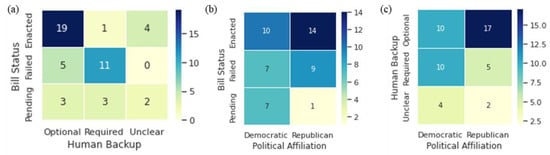 Contingency matrices to test the statistical associations of the categorical variables for (a) status vs. human requirement, (b) status vs. political affiliation, and (c) human requirement vs. political affiliation.