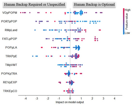 Figure 6 is the output of the SHAP feature ranking method explained above. The features on the left are in the order of their level of contribution in predicting the positive target class, which is that a human backup driver is optional. Each point on the plot expresses two values associated with each data instance. The color code as shown in the legend is the relative value for that feature, with red and blue representing higher and lower feature values, respectively. The horizontal position is the SHAP value indicating the level of impact of that feature in predicting the target class. The positive and negative SHAP values indicate the impact level in target class prediction as indicated for that direction, with the positive target class being that a human backup driver is optional. Data instances with similar SHAP values will appear as a spatial cluster at that position.