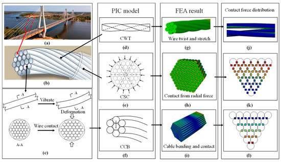 (a) Cable-stayed bridge; (b) stay cable; (c) cable vibrates and bends; (d) contact caused by wire twist; (e) contact caused by the sheath compression; (f) contact caused by cable bending; (g) twisting model; (h) radial compression model; (i) wire bending contact model; (j) contact pressure distribution from wire twist; (k) contact pressure distribution from sheathing compression; (l) contact pressure distribution from wire bending.