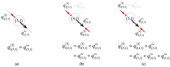 Superposition of contact pressure at diagonal contact points: (a) contact force and twisting force in the (5,1) wire, and is the twisting force in (5,1) wire, is the contact pressure at the contact point in (5,1) wire, (b) contact force and twisting force in (4,1) wire, (c) contact force and twisting force in (3,1) wire. The red arrow indicates the contact force and the black arrow indicates the twisting force of each wire.