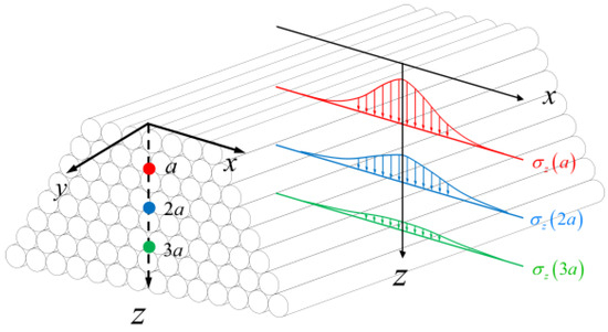 An important source of contact pressure between wires arises from the inward radial force generated by the compression of sheaths, fixtures, and the like, causing the internal wires to come into close contact. A complete cross-section of a cable is typically composed of nearly a hundred wires. When in close contact and without slippage, the contact pressure between the wires is transmitted through force chains, following the principles of Boussinesq distribution. As Figure 8 shows, the contact pressure becomes smaller as the depth increases, and the farther away from the place where the load is applied, the smaller the contact pressure. The distribution of contact stress in two-dimensional planes and three-dimensional spaces is related to the magnitude of the external radial force , the distance to the outermost sheath , and the longitudinal distance considered from the position where the load is applied. By integrating the Boussinesq distribution over the longitudinal axis (x-direction), the formula for calculating contact pressure can be obtained: