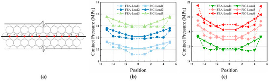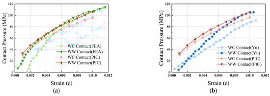 To validate the PIC theoretical model for contact pressure established in the previous chapter, a comparative analysis was conducted between the computational outcomes and finite element simulation results, and the similarity of the law is illustrated by comparing with the experimental results in other studies.