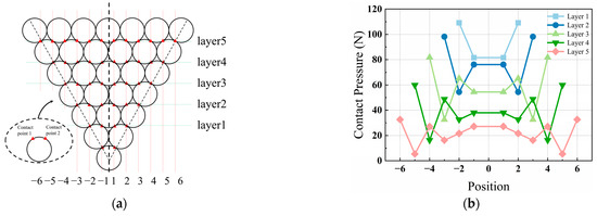 If the contact points between the wires are situated along the diagonal of the cable, as Figure 4(a.2) shows, the path for the inward transmission of contact pressure is distinctly clear. All the upper-layer wires transmitting contact pressure are aligned along the line connecting the upper-layer wire to the central wire. The contact pressure generated by twisting can thus be directly transmitted to the calculated contact point and can be directly computed as follows: