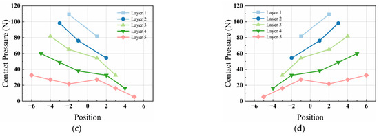 If the contact point between wires is not on the diagonal and is situated between different layers, as shown in Figure 4(b.1–b.3), the inward transmission path of contact pressure becomes more intricate, necessitating individual consideration for each wire’s position. In such cases, the angle between the upper-layer wire and the central wire must be taken into account, and a reduction in the twisting force should be applied before superposition.