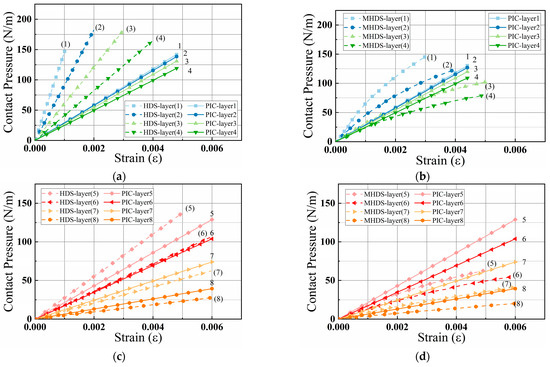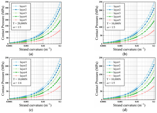 The relationship between contact stress in different layers and the curvature of the wire: (a) , ; (b) , ; (c) , ; (d) , .