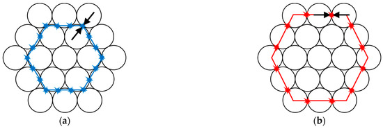 This paper takes parallel wires as an example, commonly utilized in engineering practice. As Figure 2 shows, the positions of the wires on the cable cross-section are denoted by , and the six contact points with the surrounding wires are indicated by .