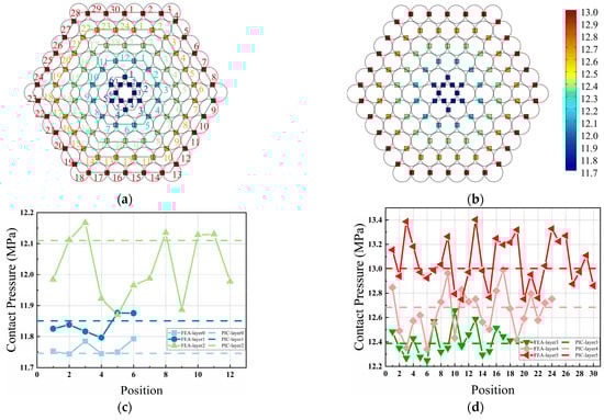 Distribution of contact stress caused by radial force in the circumferential wires of the same layer: (a) contact point number of each layer of wire; (b) PIC result of contact stress at circumferential contact points; (c) comparison between FEA and PIC for layers 0 to 2; (d) comparison between FEA and PIC for layers 3 to 5.