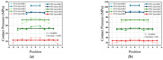 Comparison of contact stress between wires in different layers: (a) and strand curvature = 0.001; (b) and strand curvature = 0.01.