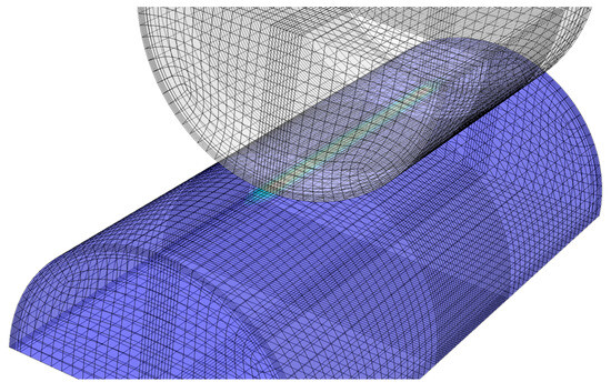 The wear model is established with reference to the Archard equation [18], and based on the contact characteristics of parallel wires, reciprocating relative displacements of two semi-cylinders is used to simulate the fretting wear. As Figure 21 shows, the contact wear model of two wires is established in ABAQUS 6.10., and relevant parameters are provided in the Table 2 below.