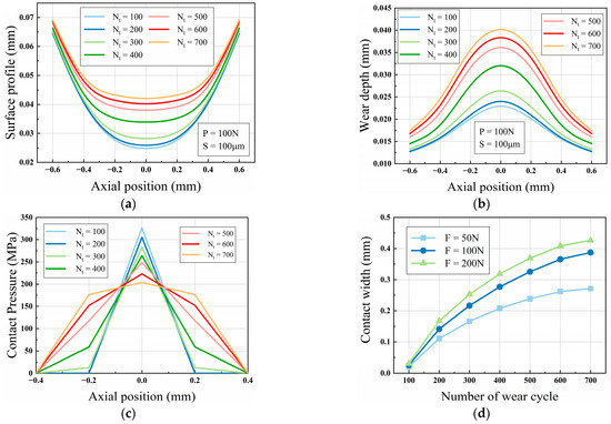 Figure 22c shows the variation in interface contact pressure with an applied load of 100 N as the cycle count increases. The peak contact pressure occurs at the center of the contact width. As the contact width increases during the wear process, the peak contact pressure decreases continuously, with the reduction becoming progressively smaller. It is expected that with the development of wear, the contact pressure distribution across the interface will become more uniform, resulting in minimal further changes to the numerical values. According to the Archard theory, under constant wear coefficient , cycle count , and sliding distance , the development of wear is primarily related to contact pressure. Therefore, the reduction in contact pressure disparity at different positions is the main reason for the “averaging” of interface wear.