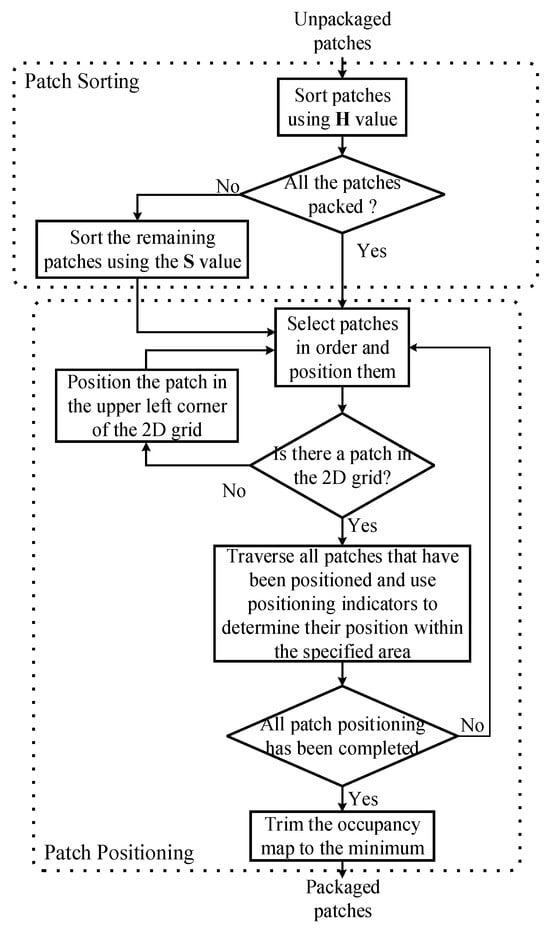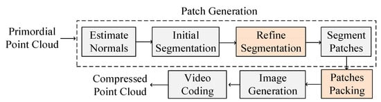 Patches generation aims to utilize the optimal segmentation strategy for projecting 3D data onto a specified plane and decomposing point cloud frames by converting them into 2D data. In TMC2, the objective of patch generation is to divide the point cloud into groups of patches with smooth boundaries, while also ensuring minimal reconstruction errors. The steps include principal component analysis to obtain the normal vector, initial segmentation of point clouds based on the normal vector, refining segmentation based on smoothing scores, and extraction of patches from connected components [6]. The area within the dashed line in Figure 1 represents the patch generation process. The goal of the patch packaging process is to generate geometric and texture images that contribute to video compression. During this process, auxiliary information, such as occupancy maps, will also be generated to indicate effective positions. The occupancy map size should be as small as possible, and the internal patches should be arranged tightly. The image generation process includes optimization operations such as geometric pixel filling, attribute pixel filling, and global allocation. Finally, all the generated images are combined into a video and encoded using HEVC [19] or other video encoders. This paper focuses on refining segmentation and patch-packing sessions. The details of these two parts will be presented in Section 3. A comprehensive description of the remaining components of V-PCC can be found in the literature [11].
