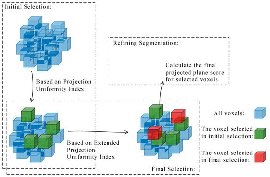 The refining segmentation is aimed at some voxels that cause the patch edge to be not smooth. The characteristic of these voxels is that the selected projection plane is too disarrayed. However, the original method does not consider the differences between voxels, and all voxels are refined segmented. Therefore, the VS-RS is proposed in this paper. Only the voxels with disarray projections are refining segmentation. A reduction of the computation time is required for refining segmentation. Figure 3 shows the overall method of VS-RS. Firstly, based on the Projection Uniformity Index, the voxels with internal projection planes non-uniform are found from all voxels. They are the results of the initial selection of voxels. Then, based on the Expanded Projection Uniformity Index, the voxels that are non-uniform when compared with neighbors are found in the remaining voxels. They are the results of the final selection of voxels. The refining segmentation will only operate on the above-selected voxels. This targeted voxel selection method improves the efficiency of refining segmentation.