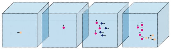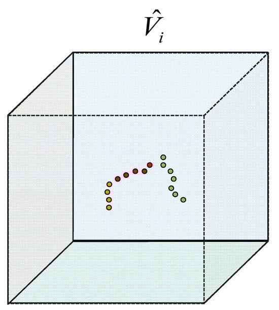 All voxels containing at least one point in the interior are recorded as filled voxels, denoted as . The number of points projected onto each projection plane is counted separately, denoted by , where represents a projection plane. Figure 4 shows an example of voxel interior point projection. There are a total of sixteen points in this voxel. Among them, five points are projected onto the posterior plane (red plane), four points are projected onto the left plane (yellow plane), and the largest number of points is projected onto the lower plane (green plane), which is seven. Therefore, the final projection plane of the voxel is the lower plane, and , where K represents the set of six projective planes.