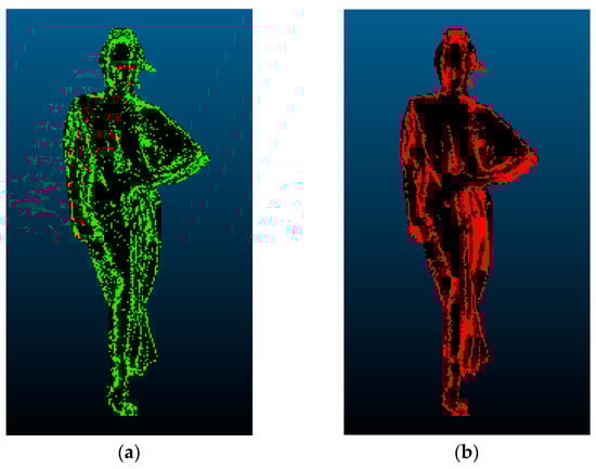 After completing the initial selection of voxels. The distribution of the selected voxels is shown by the green voxels in Figure 6a. The distribution of the voxels that have changed their projection plane during the V-PCC refine segmentation process is shown by the red voxels in Figure 6b. It can be found that some remaining voxels have not been selected. These voxels cluster around the initial selection voxels. Based on this, the final selection of voxels was determined.