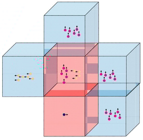 At this stage, the reference range of the Projection Uniformity Index is expanded from within voxels to other voxels. They are the nearest neighbor voxels of the initial selection voxels. These nearest neighbor voxels can only be voxels that have not been selected before and then labeled as candidate voxels. The positional relationship is shown in Figure 7. The two red voxels are the initial selection voxels, and the four blue voxels are the candidates for the final selection of voxels. When determining whether the middle red voxel is selected, the lower red voxel is not within the calculation range. Therefore, this calculation only involves 4 blue voxels. We use the KD-tree method to find the nearest neighbor filling voxels.