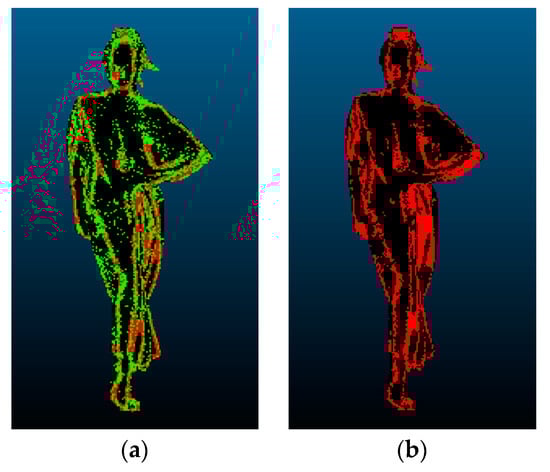 where A is the voxel set that changes the projection plane after refining segmentation in the process of using TMC2, and P is the set of voxels selected using VS-RS. N(·) denotes the number of voxels. AR denotes the proportion of A in P to P. DR denotes the proportion of A in P to A. As shown in Table 5, the value of DR is 85.32~95.45%, and on average is 93.22%. This indicates that most of the voxels selected using the VS-RS algorithm are related to the voxels whose projection plane index changes during the refining segmentation process in TMC2. The accuracy of VS-RS is high in predicting voxels that are associated with the refined projection plane index. The average value of AR is 85.19%. Most of the voxels that should be refining segmentation are correctly selected. In addition, the distributions of A and P can be visually compared. The color region in Figure 10a represents the distribution of P. The green voxels are the initial selection voxels, while the red voxels are the final selection of voxels. The red region in Figure 10b represents the distribution of A. The two distributions are essentially identical. Therefore, it has been proven that the VS-RS is highly accurate.
