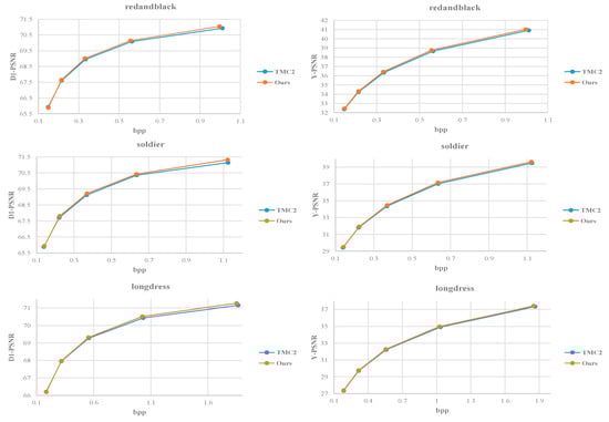 When the two methods proposed in this paper are used in combination, Table 9 shows the comparison results with TMC2-18.0, indicating that the method has performed well. The algorithm proposed in this paper can reduce the time consumption of coding by up to 43.34%, with an average reduction of 31.86%. The average BD-rate coding gain of D1 is −1.39%, and the soldier test point cloud has the best effect, up to −2.86%. The average BD-rate coding gain of D2 is −1.58%, and the longdress test point cloud has the best effect, up to −3.07%. The BD-rate coding gain of Luma is −1.35% on average, and the redandblack test point cloud has the best effect, up to −2.62%. Therefore, the algorithm proposed in this paper can improve the performance of point cloud compression while reducing its complexity.