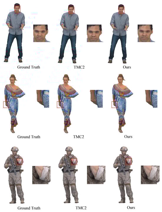 Additionally, we also drew the RD curve according to the new algorithm and TMC2. The bit rate is calculated by the number of bits per input point (bpp). Distortion metrics include D1 and Luma. Figure 12 shows the RD curves of the three test sequences. The proposed method leads to performance improvements, particularly at high bit rates. The proposed method is significantly better than TMC2 in terms of subjective quality. Figure 13 shows a subjective quality comparison between TMC2 and ours. From an overall perspective, our method better preserves the details of the point cloud. In addition, the subjective quality of the localized point cloud reconstructed by our method is also better than that of TMC2.