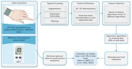 - Singha, S.K.; Ahmad, M.; Islam, M.R. Multiple Regression Analysis Based Non-Invasive Blood Glucose Level Estimation Using Photoplethysmography. In Proceedings of the 2021 International Conference on Automation, Control and Mechatronics for Industry 4.0 (ACMI), Rajshahi, Bangladesh, 8 July 2021; IEEE: New York, NY, USA, 2021; pp. 1–5. [Google Scholar]