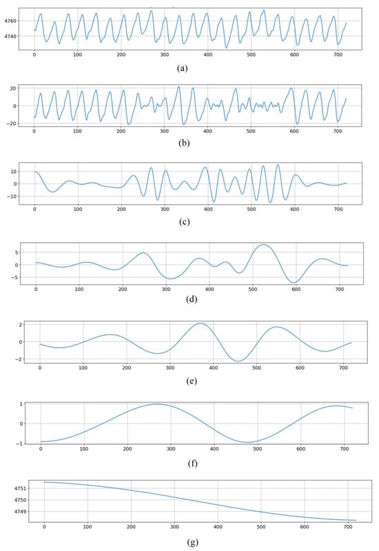 The initial IMF (IMF 1 at Figure 2b) captures the highest frequency oscillations with amplitudes around −20 to 20. Subsequent IMFs show progressively lower frequency oscillations and smaller amplitude ranges. IMF 2 at Figure 2c oscillates between about −10 to 10, IMF 3 at Figure 2d oscillates with smoother oscillations between −5 and 5, and IMF 4 depicted in at Figure 2e shows much wider oscillations within an amplitude of −2 to 2. The fifth IMF (IMF 5 at Figure 2f) has a very narrow amplitude ranging from −1 to 1, indicating very smooth oscillations. The last IMF or residual (Figure 2g) shows a nearly constant trend with amplitudes around 4750, indicating a low-frequency drift in the signal.