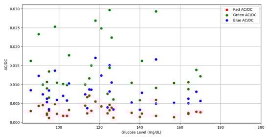 The AC-to-DC ratio (AC/DC) represents the ratio of the pulsatile (i.e., AC) to the baseline or static (i.e., DC) component of the PPG signal. The relation between the AC/DC value and blood glucose level may be causal. However, there is not much research on this subject. A proportional association between AC/DC values and glucose levels was demonstrated in one study [15]. The relationship between blood glucose levels and AC/DC values of PPG signals was demonstrated in another study [16]. A recent study [17] showed a correlation between perfusion index (PI) and blood glucose concentration. The perfusion index is a measure of pulse strength in a specific area of the body and is a relative assessment of the blood flow to that area and similar to the AC/DC. They suggested that AC/DC as PI could be a reliable indicator for noninvasive blood glucose estimation. Blood glucose affects light scattering, and as glucose level in the blood rises, the amount of light scattered decreases. As a result, the total absorbed light decreases. PI, which depends linearly on the magnitude of the pulsatile component of blood flow, also decreases. They showed a negative linear correlation between PI and blood glucose concentration. The AC (or DC) detection from a PPG signal was performed using the AC (or DC) determination algorithm [18]. Figure 3 shows AC/DC values versus glucose levels for 34 subjects used in this study.