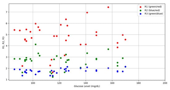 R1, R2, and R3 are important metrics in assessing the strength of a PPG signal as they provide a normalized comparison of the AC and DC components of the signal and can provide important information about cardiac output and peripheral perfusion. These calculated ratios, derived from multi-wavelength PPG data, have been utilized as features in this study to improve blood glucose level predictions. Figure 4 shows the trends of R1, R2, and R3 versus glucose levels for 34 subjects. As shown in Figure 4, the R3 value is the smallest compared to R1 and R2. As the red signal intensity is smaller, R1 and R2 are relatively larger than R3.