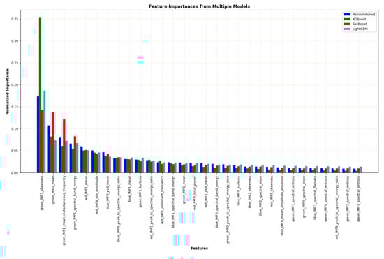 The overall feature extraction and selection procedure is illustrated in the flowchart of Figure 7. Feature selection is primarily guided by the importance of each feature, evaluated using different methods depending on the model. For random forest, the Gini importance method was used, while for XGBoost and CatBoost, gain-based approaches were employed. The evaluation of LightGBM included both split- and gain-based methods. We then improved the model’s performance by selecting the most significant features based on the feature importance.